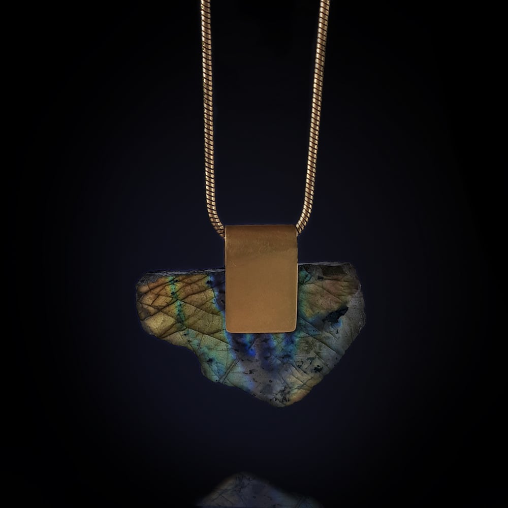 Labradorite crystal (Madagascar), gold-plated brass, gold-plated chain.