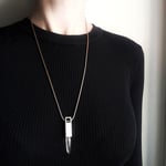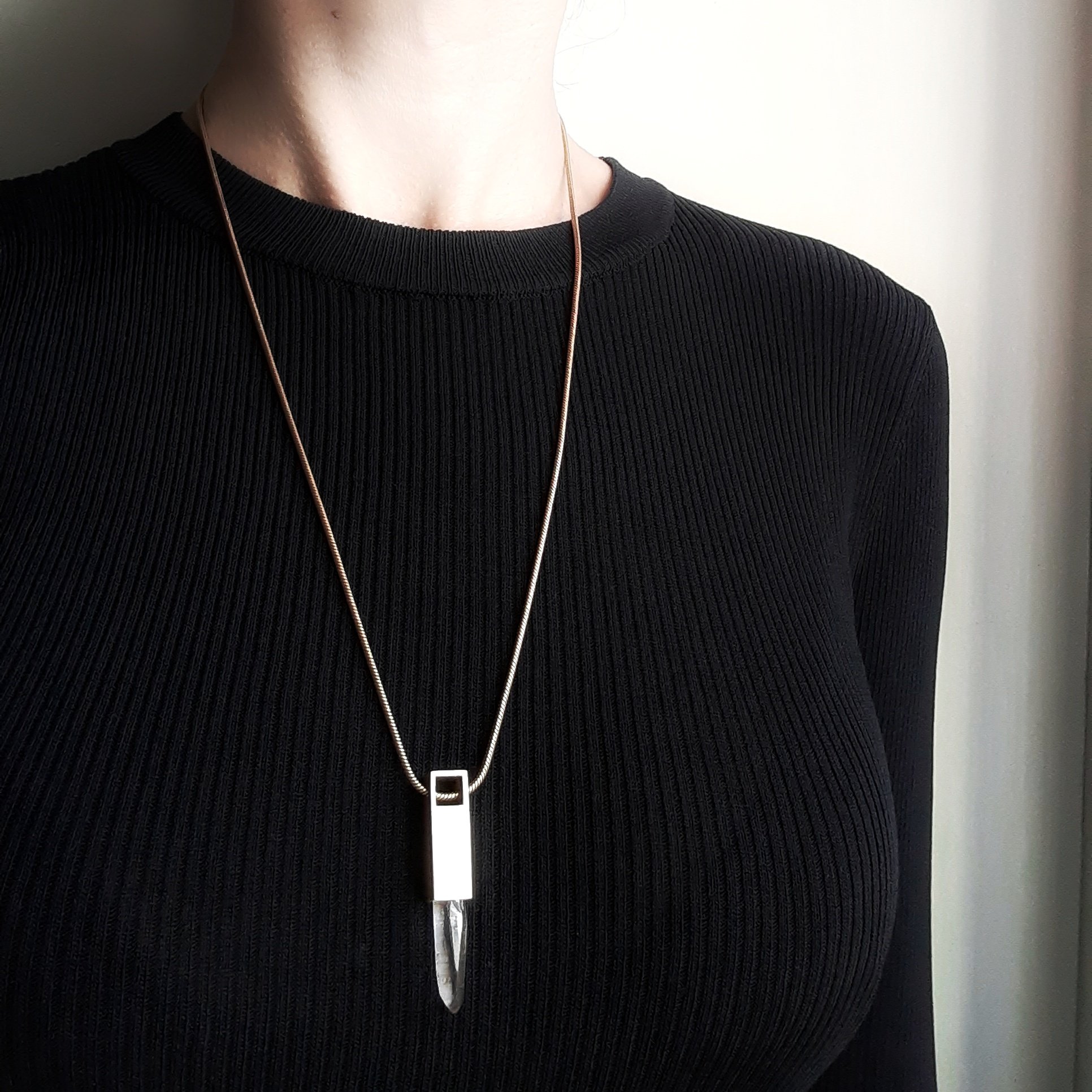 The contrast between the natural stone and the clean cut setting, makes this an unusual sleek raw crystal necklace that will be noticed.